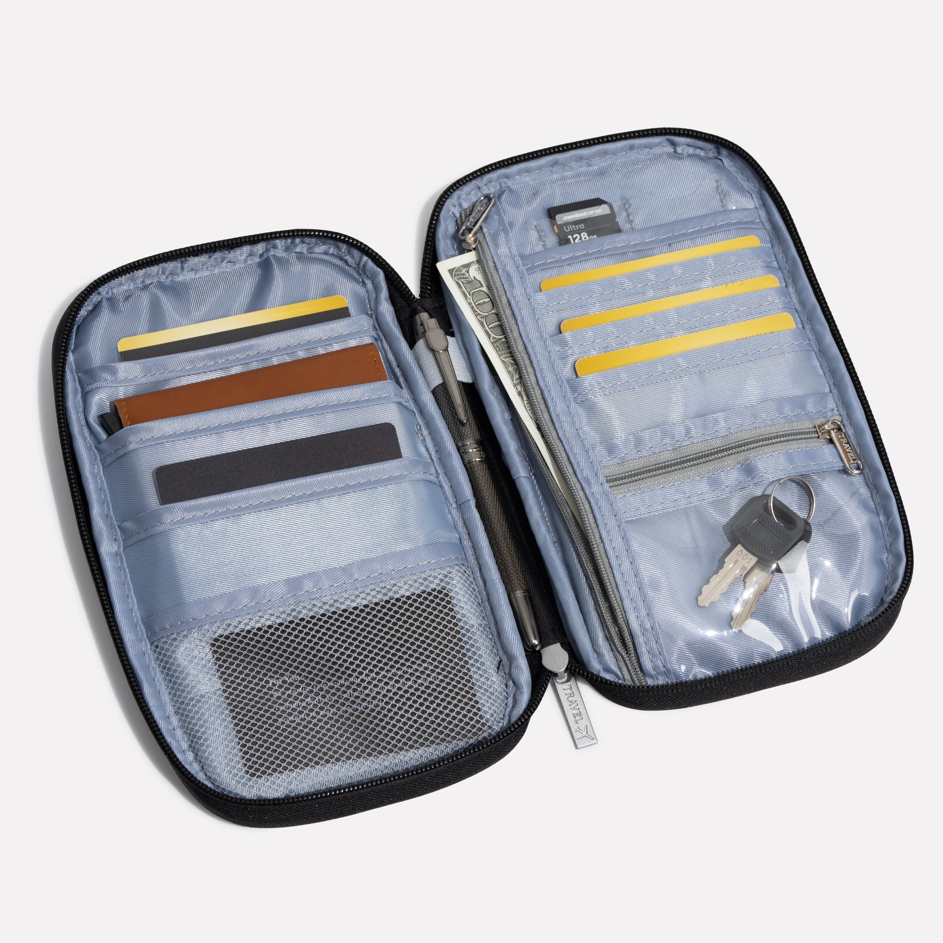 - Holds up to 4 passports + cards, documents & cash